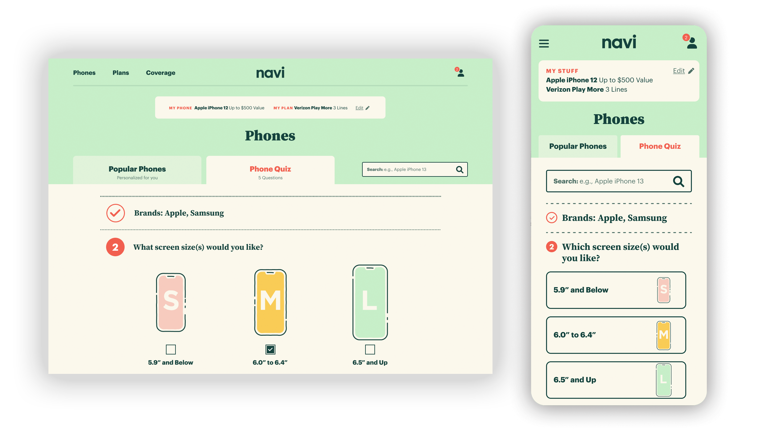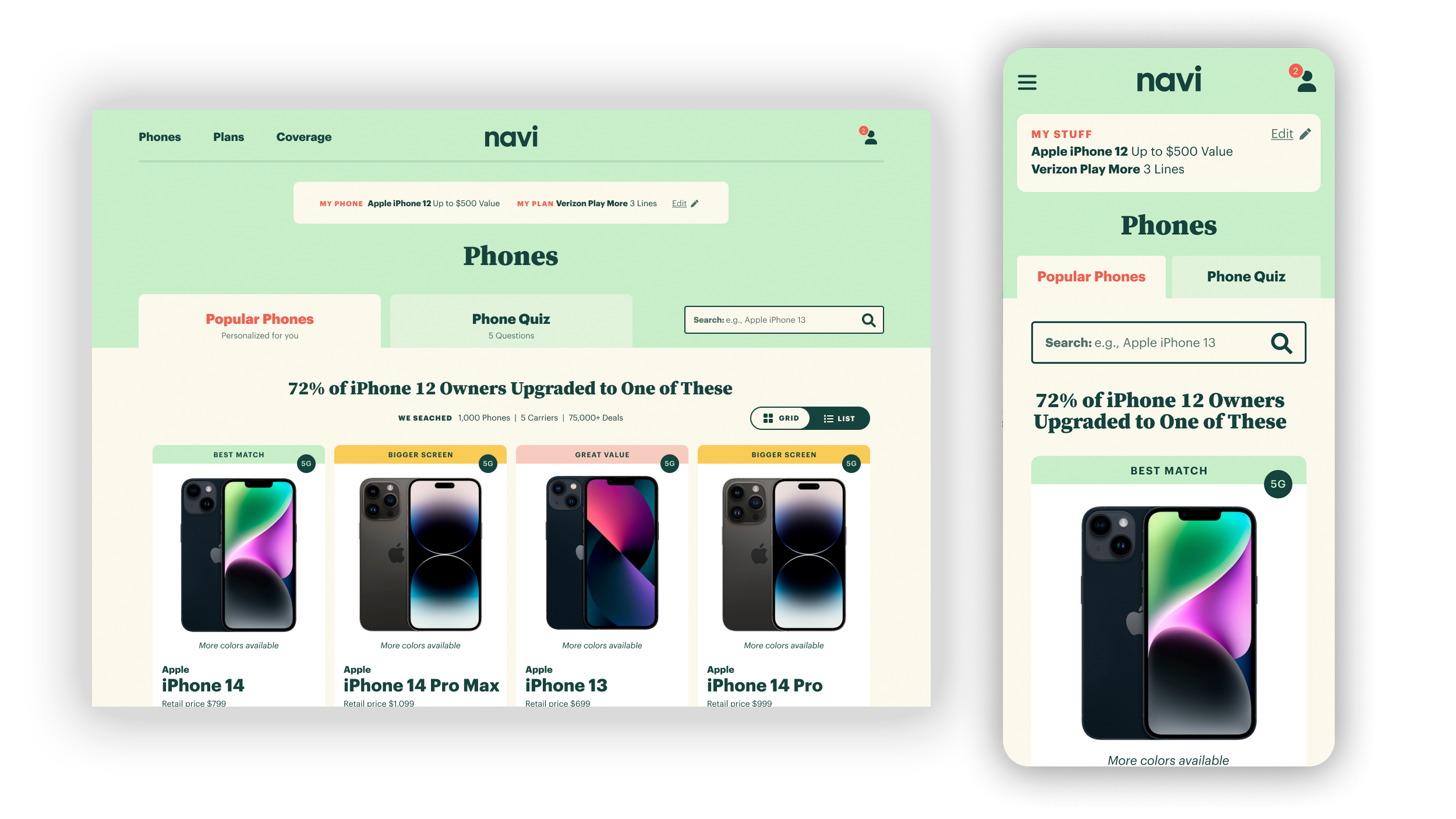 Dashboard: The phone dashboard default view shows the most popular phones based on a user's trade-in. Users have the ability to switch views in order to see larger phone images (shown above) or compare features (not shown). For users who need more guidance, Navi offers a fun illustrated quiz to provide recommendations based on their preferences for camera quality, screen size, battery life and other features.