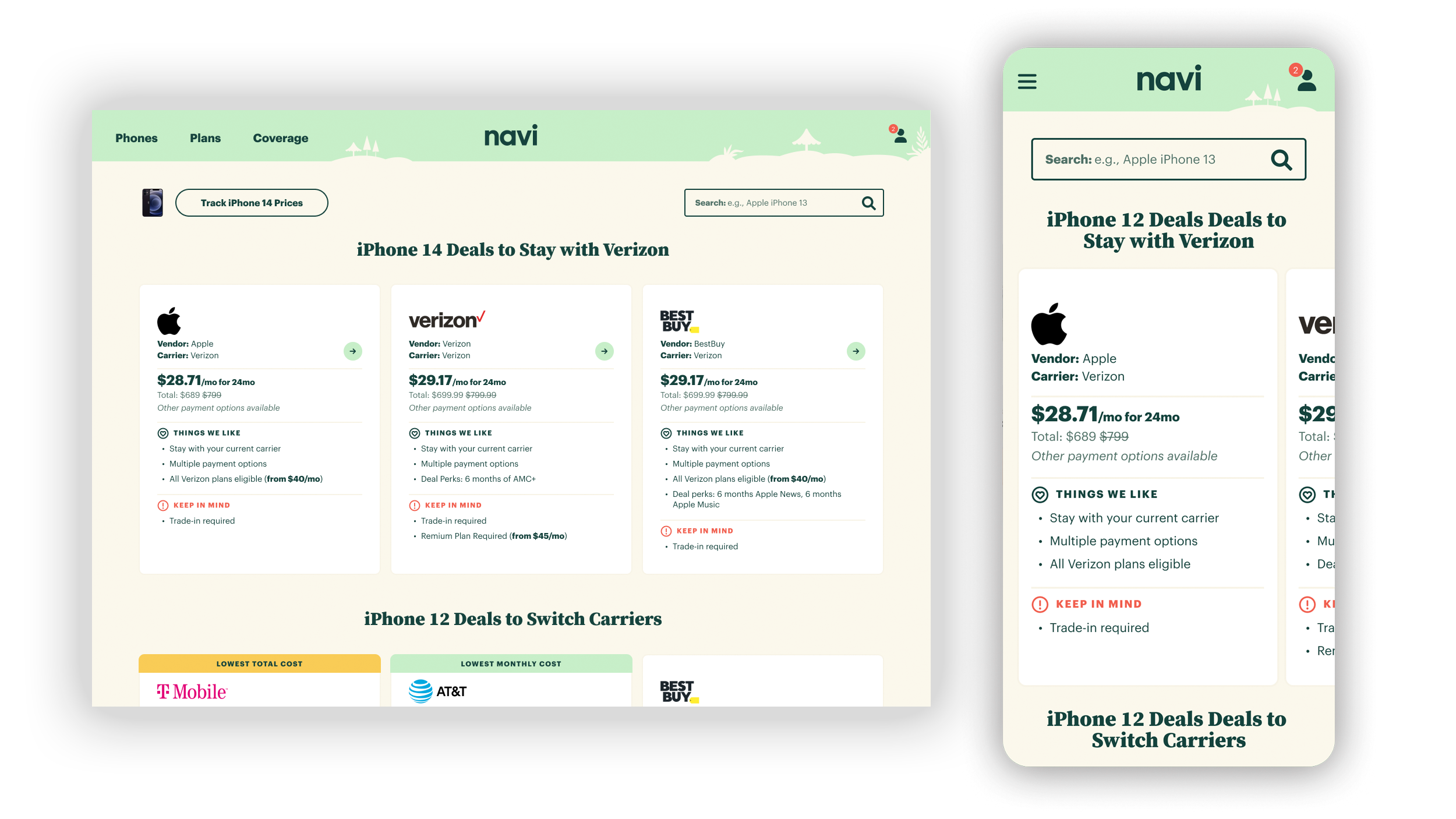 Deal Snapshot: Once a user has selected a phone model, Navi presents them with all of the best deals for staying with their current carrier (the most common behavior) or switching carriers, which often results in a lower price on the phone.
