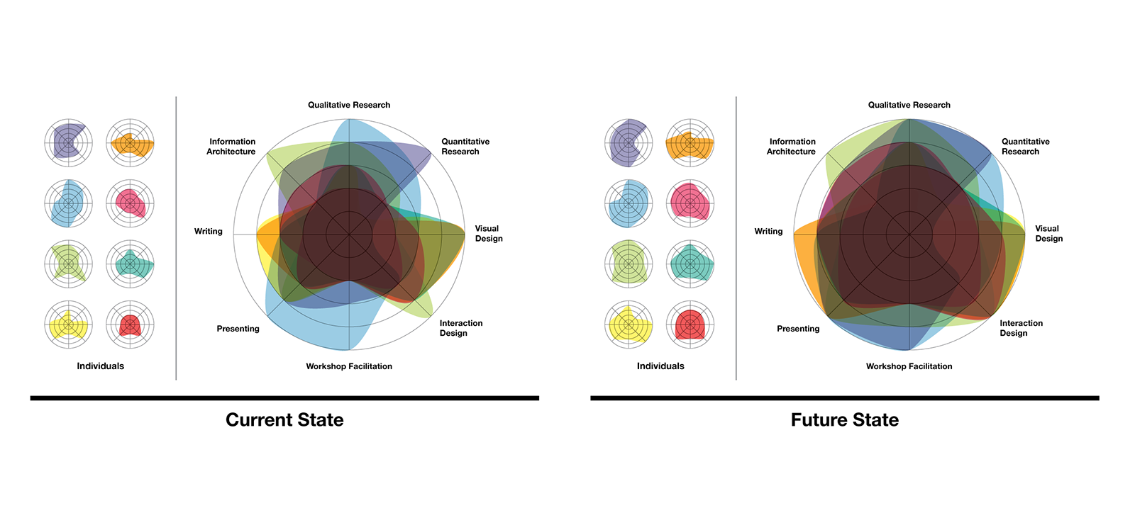 Solution: A streamlined set of roles that prepared us for growth, created clear career paths and allowed team members to broaden their skillsets. Separate paths were created for researchers working outside of product teams and generalist designers embedded on cross functional teams. Each path contained separate opportunities for management track and individual contributor track. A team exercise to explore the "shape" of each designer helped uncover where team members wanted to grow.